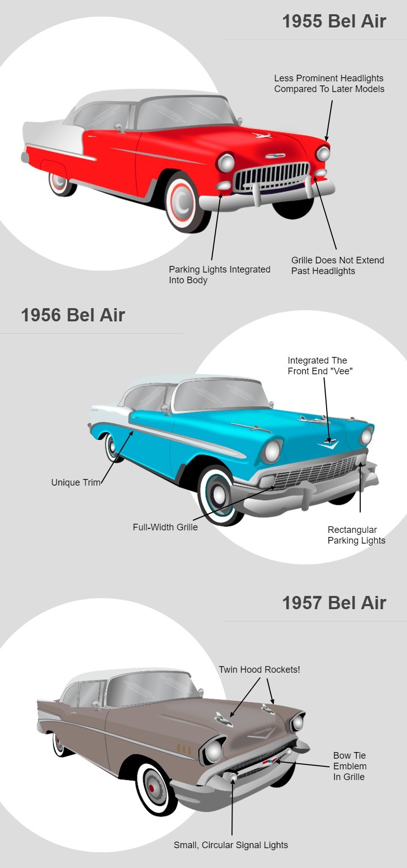 This Spotter’s Guide features some of the unique exterior design details for Tri-Five Bel Airs. The illustrated graphic shows the evolution in design of Chevy’s Bel Air from 1955 through 1957 and provides at-a-glance reference points to help anyone identify the correct model year.